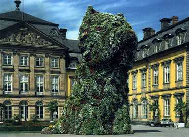 JEFF KOONS Foto: D. Schwerdtle |  | | Puppy1992Stahl, Holz, Erde, 20.000 Blumen6,5 m x 5 m x 12 mSchloss Arolsen bei KasselEs ist sehenswert. Der Ort und das Werk Puppy scheinen geradezu füreinander geschaffen zu sein.... Wenn Hund und Haus am Hügel ins Blickfeld rücken, können sie geradezu atemberaubend sein. Zusammen sehen sie aus wie Andenken von einem anderen Planeten, wo Regale mit Kleinkram gefüllt so hoch ragen wie der Eiffelturm.