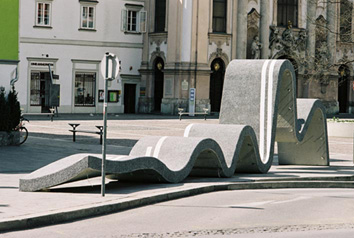 Gewicht: 15 tGraz 2003Ein Stück Autobahn, betongewordenes Symbol für Technik und Naturbeherrschung, aber auch für Machbarkeitswahn und Umweltzerstörung, wird von unsichtbaren Energien hochgehoben, gestaucht, zur Hochschaubahn umgeformt. Eine Metapher für die Nichtigkeit und Vergänglichkeit menschlicher Handlungen mit gleichzeitiger Wertschätzung sisyphorischer Anstrengungen. | | | |