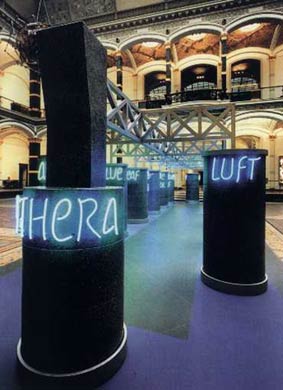 IAN HAMILTON FINLAY Foto: G. Steidl, Rohrbach Cythera1991Kunststein, Neon, Nirosta15,9 m x 4 m x 2,8 mAusstellung "Metropolis" Martin-Gropius-Bau, Berlin
