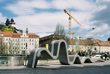 Gewicht: 15 tGraz 2003Ein Stück Autobahn, betongewordenes Symbol für Technik und Naturbeherrschung, aber auch für Machbarkeitswahn und Umweltzerstörung, wird von unsichtbaren Energien hochgehoben, gestaucht, zur Hochschaubahn umgeformt. Eine Metapher für die Nichtigkeit und Vergänglichkeit menschlicher Handlungen mit gleichzeitiger Wertschätzung sisyphorischer Anstrengungen. | | | |