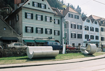 Gesamtgewicht: 25 tWakolbingers Werk ist ein ironischer Beitrag zum Problem der Stadtmöblierung: zwei an futuristische Liegen/Fauteuils erinnernde Körper, die nach dem Prinzip Hülle und Kern aus einem Stück generiert wurden. Sie können als monumentale Sitzobjekte oder als abstrakte Skulpturen gelesen werden. | | | |