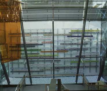 THOMAS LOCHER Satz und Satzfelder1998aluminium, engraved and paintedInstallation: L 12 m, H 6 m L 472, H 236 in.Landesgirokasse Stuttgart